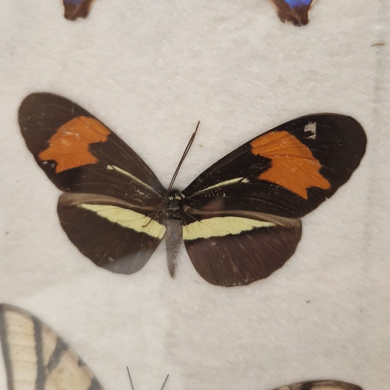Een lijst met vier ingelijste vlinders